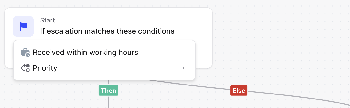Now that you have all configurations created, you can start your path with or without conditions. Conditions we offer at the moment are working hours and priority. You can choose to start from either