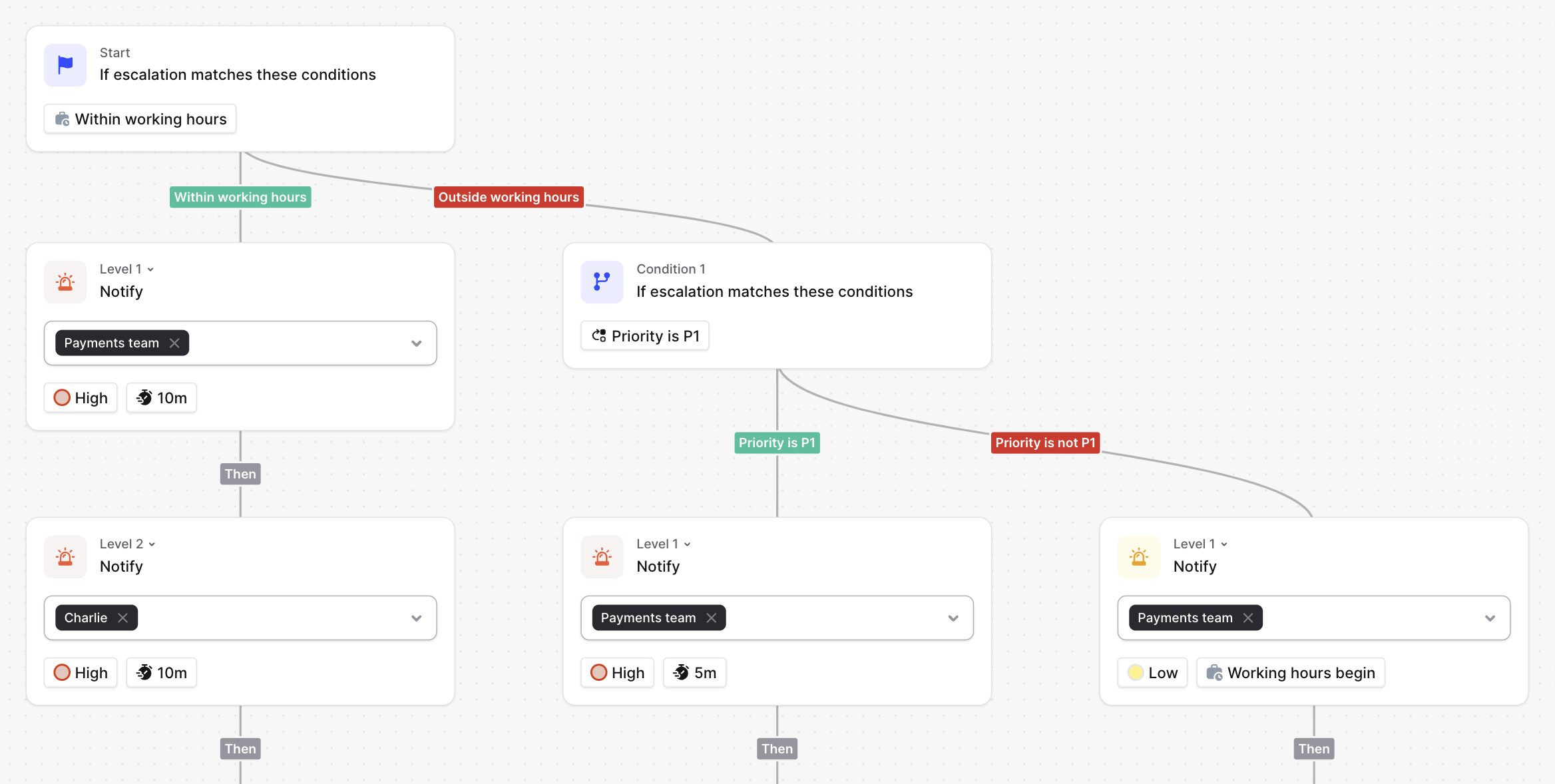 - 1st branch will send Alerts within working hour s with high urgency notifications to the person on call from the Payments team and wait 10 minutes until escalating to the next level