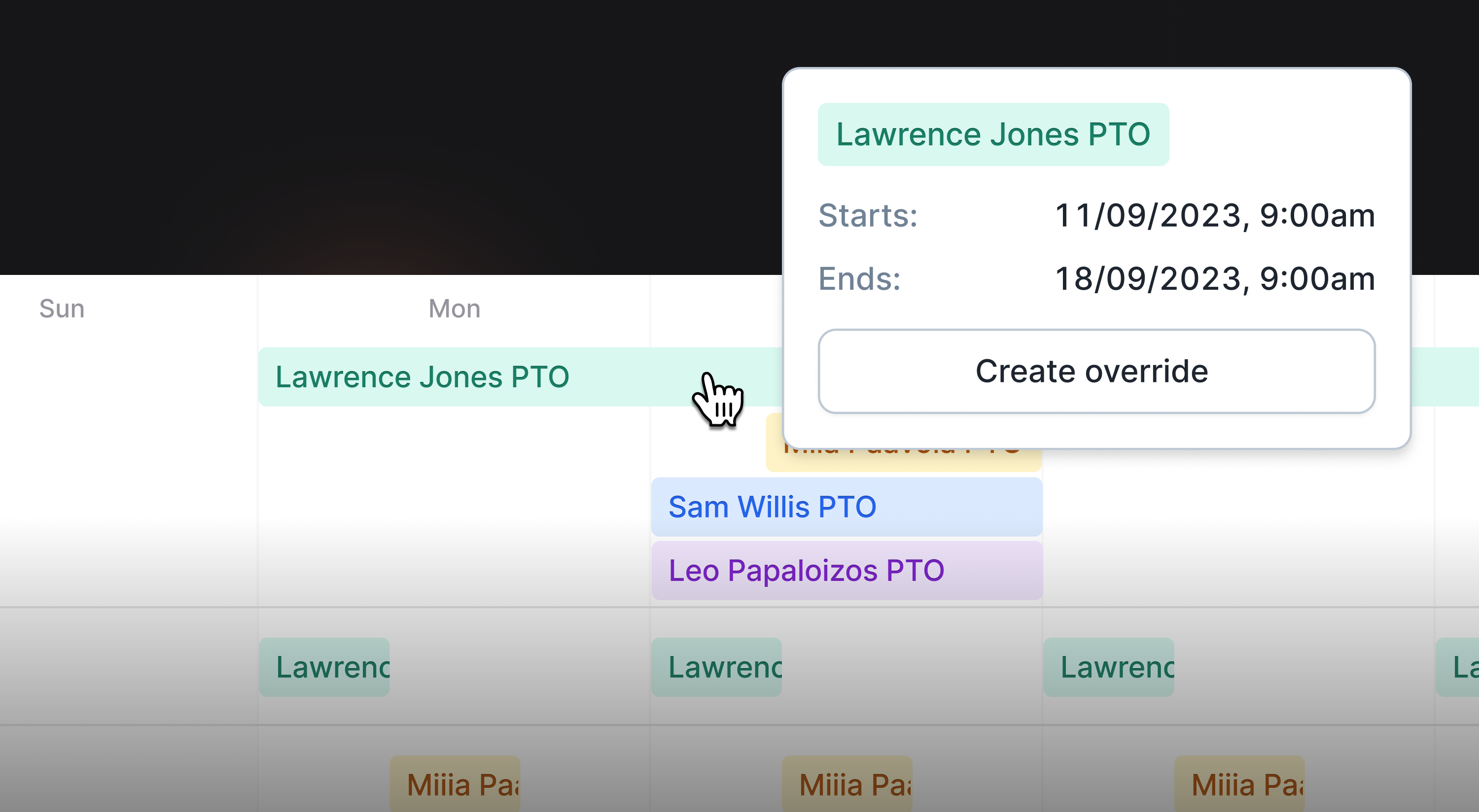 Once you’ve set up some public holiday or calendar feed subscriptions, we’ll automatically surface relevant holidays alongside your On-call schedule shifts. To easily arrange cover, hover over the holiday and click Create override !