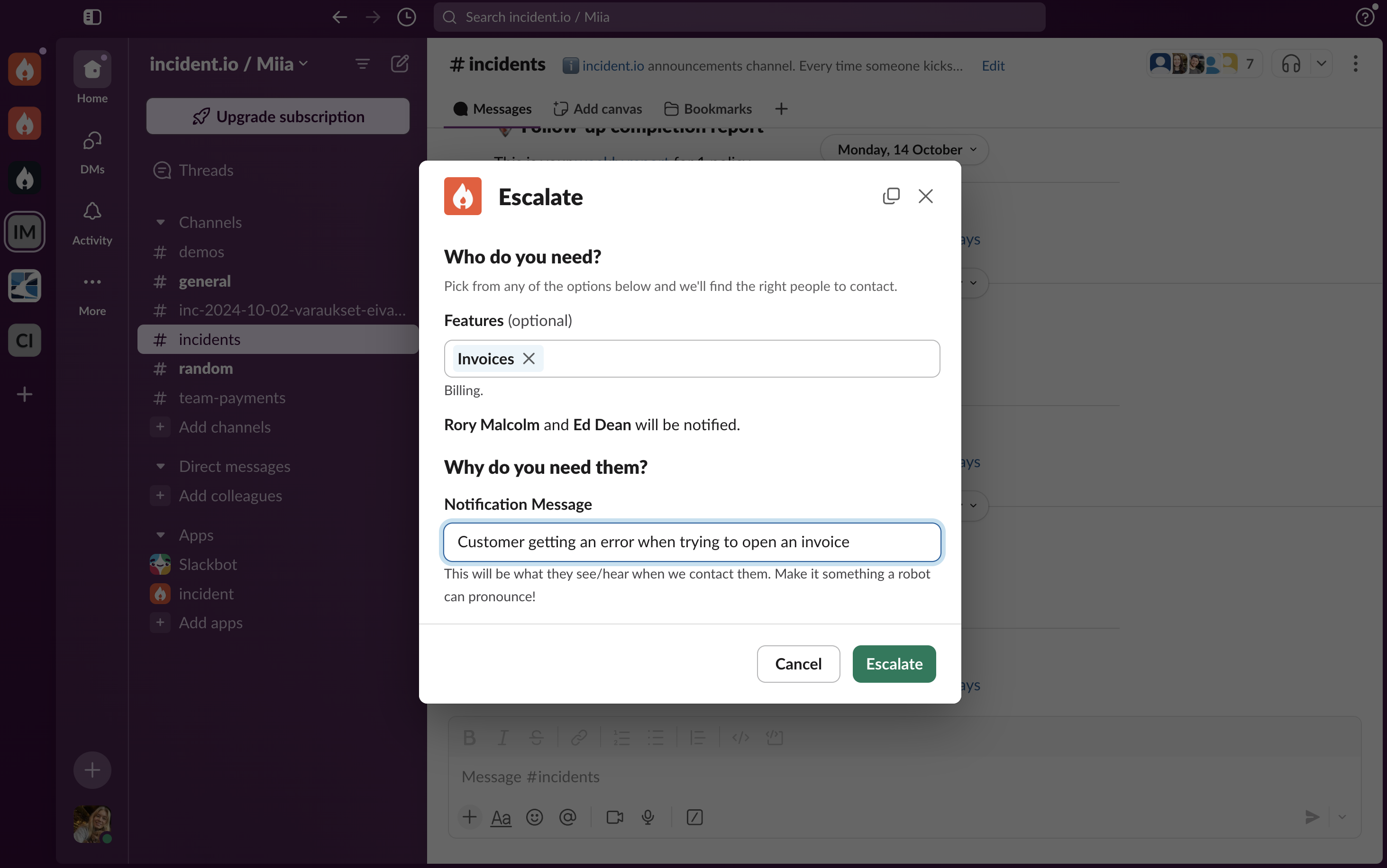 After initiating, they’ll see a modal in either Slack or the Web Dashboard where they can select the appropriate feature. Thanks to our Catalog configuration, we know exactly whom to page by linking Feature → Team → Escalation Path.