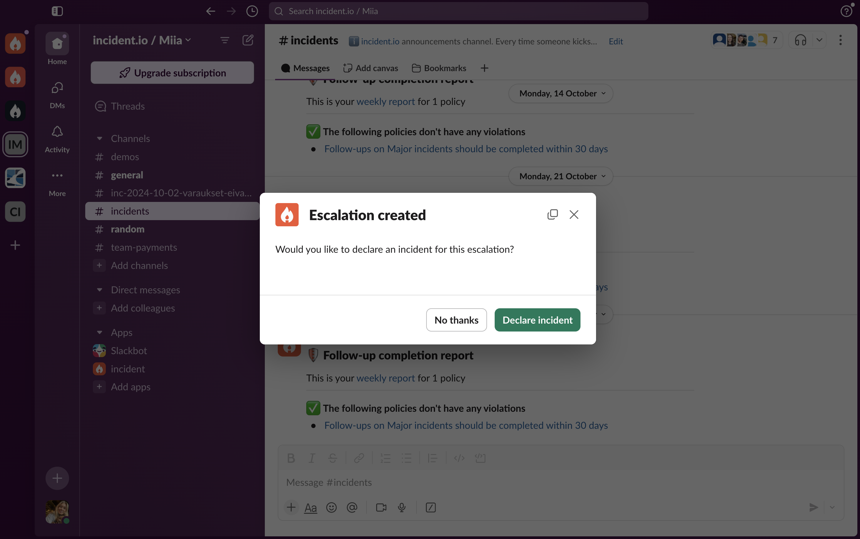You are also able to escalate incidents further or just escalate before creating incidents. To page, team members can go to Escalations in our Web Dashboard or use the/inc escalate command in Slack or Microsoft Teams.