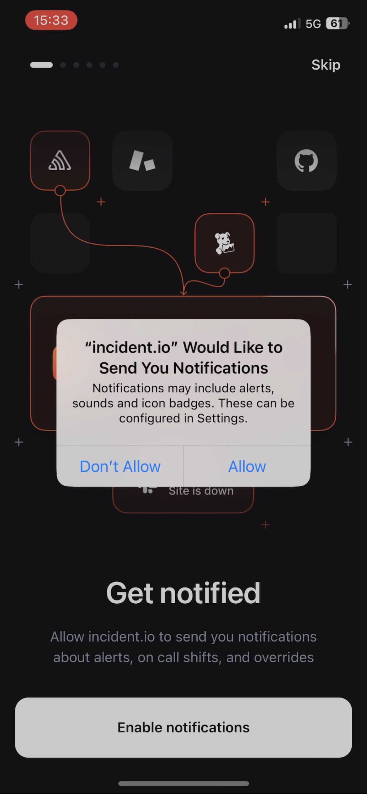 When you have downloaded the incident.io mobile app and signed in via Slack or SAML, we will guide you to an onboarding flow to help you set up the right notifications. This will include: - Enabling Push Notifications