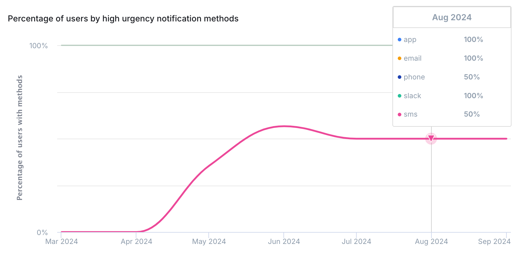You’ll be able to track how your users’ notification configuration is changing over time. This allows you to follow how your migration is going, e.g. if onboarding sessions are increasing on-call readiness as you’d want.