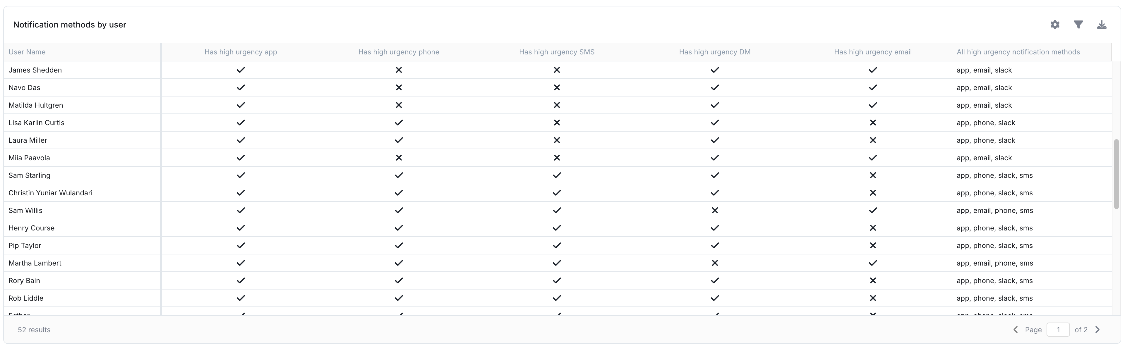 You’ll also get access to a table of all notification methods by user. This table reports all your users and the notification methods they have set up. You can easily sort by all the available columns and add column-specific filters, e.g. “who is not reachable outside of Slack”.