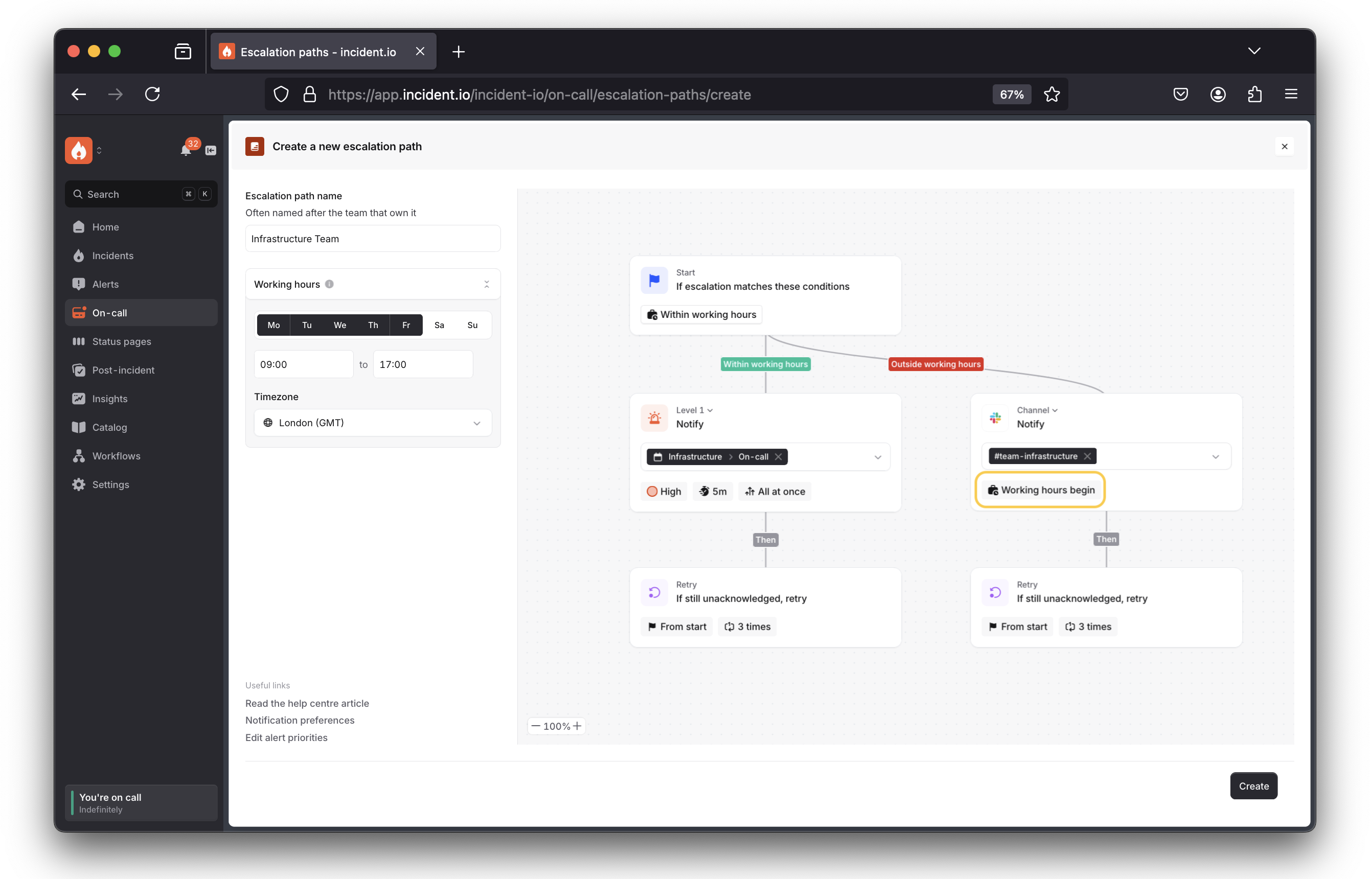 Below you can see an example of how we can hold an escalation by setting the time to acknowledge to untilWorking hours begin in our outside working hours branch.