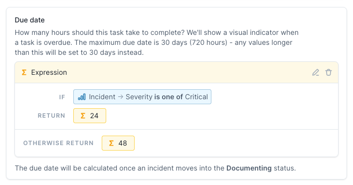 Not every incident is equal. Some are more complex, some more serious in nature, others may involve completely different sets of teams. It might seem impossible to decide on a due date for tasks across all of that but thankfully you can easily set multiple conditions on when a task might be due. To do so, begin editing a post-incident flow task and look towards the due date section. You are now able to set an expression powered by incident fields along with your own catalog of custom fields to decide on the values to return here. In this example we’re saying we want the post-mortem to be completed as soon as possible if the incident is of aCritical severity, otherwise you can take a bit longer: