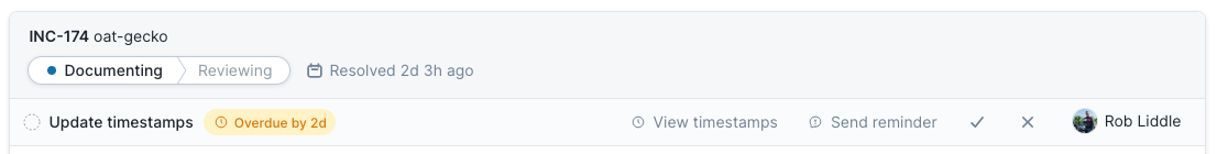 Once an incident transitions into a post-incident flow, all of the tasks will have their due dates set. Within the UI you are able to see when each task is due, and who it is currently assigned to. When a task becomes overdue it will be highlighted in the UI: