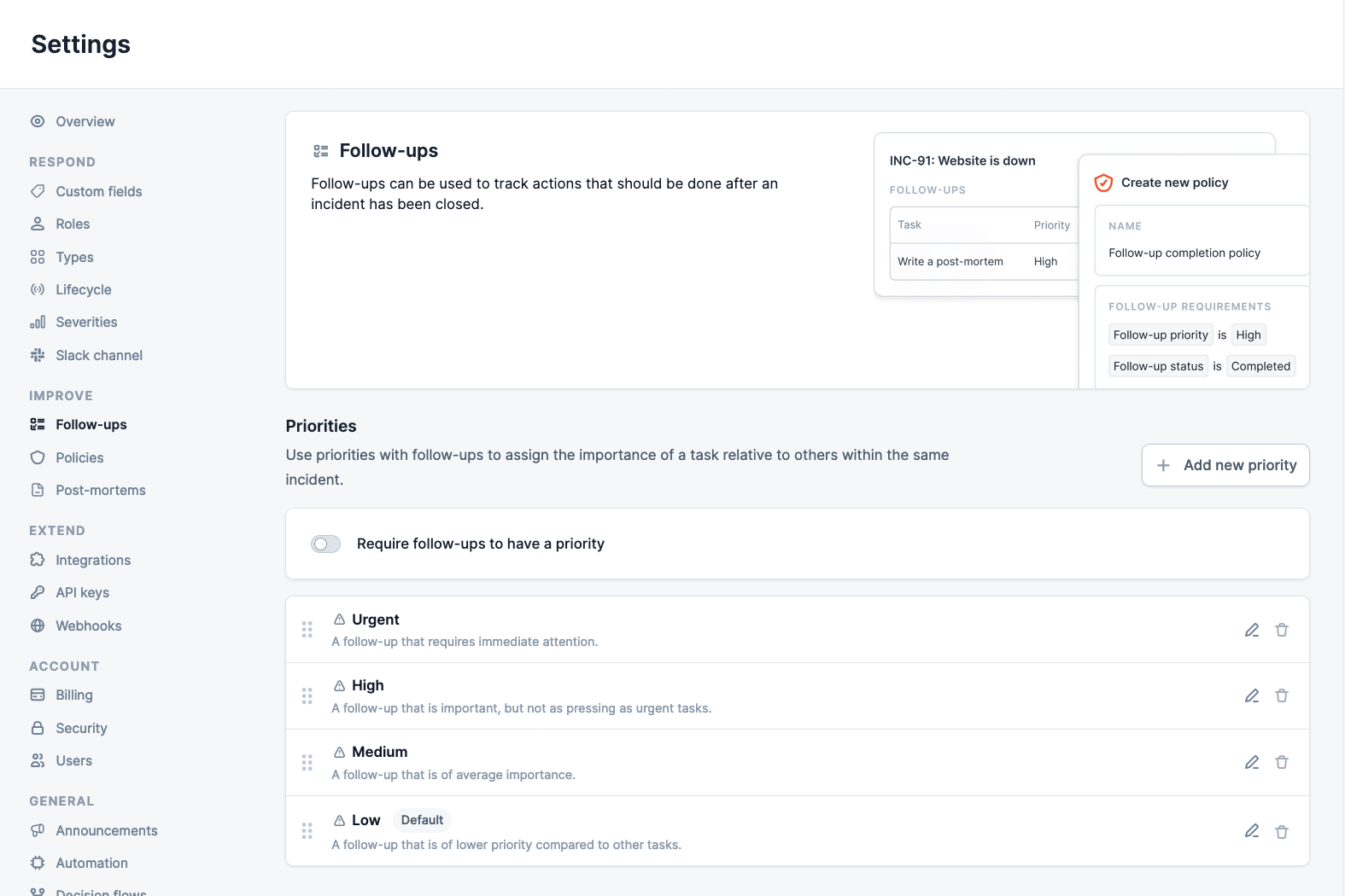 Navigate to the Settings → Follow-ups page to configure:- If follow-ups are required to have a priority