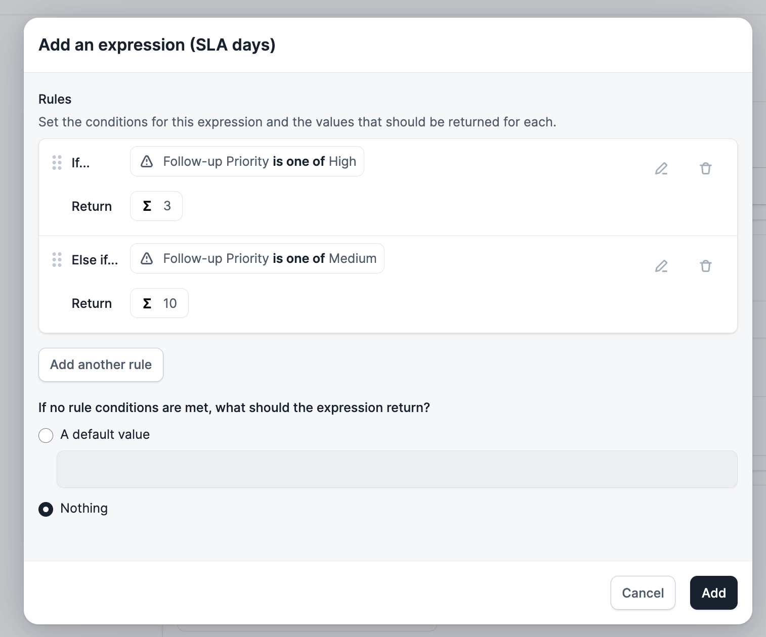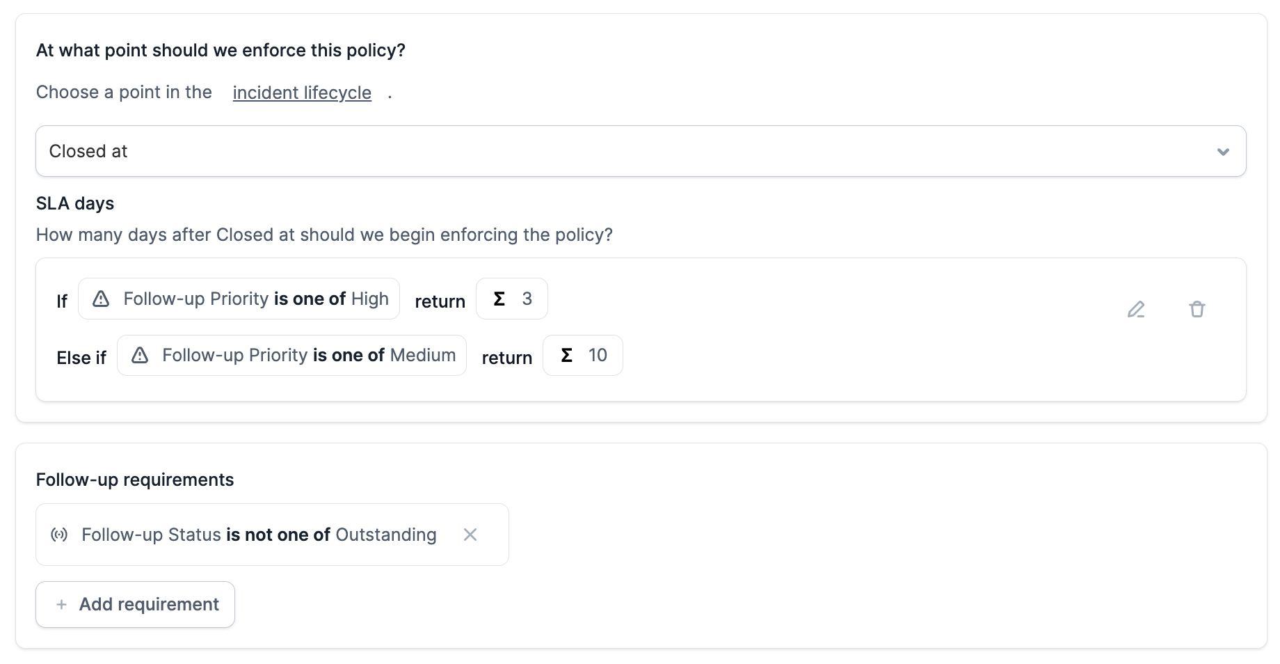 Navigate to the Settings → Policies page, and select New Policy and then choose Follow-ups as the Policy type . Within the Follow-up requirements section, you are able to use Follow-up Priority alongside Expressions to determine the SLA that you want to set, allowing you to build a policy that says:- “All high priority follow-ups must be completed within 3 days, medium priority follow-ups within 10 days”.