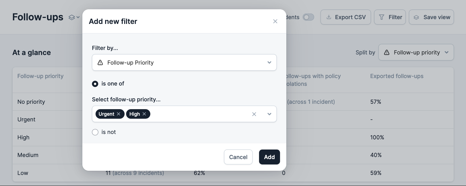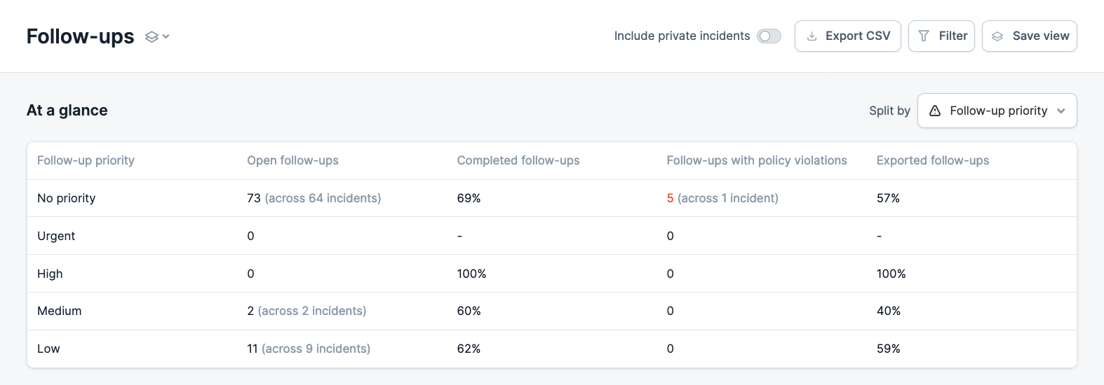 Navigate to the Follow-ups reporting page , and select Follow-up Priority from the Split By dropdown in the top-right of the screen, this will update the At a glance table.