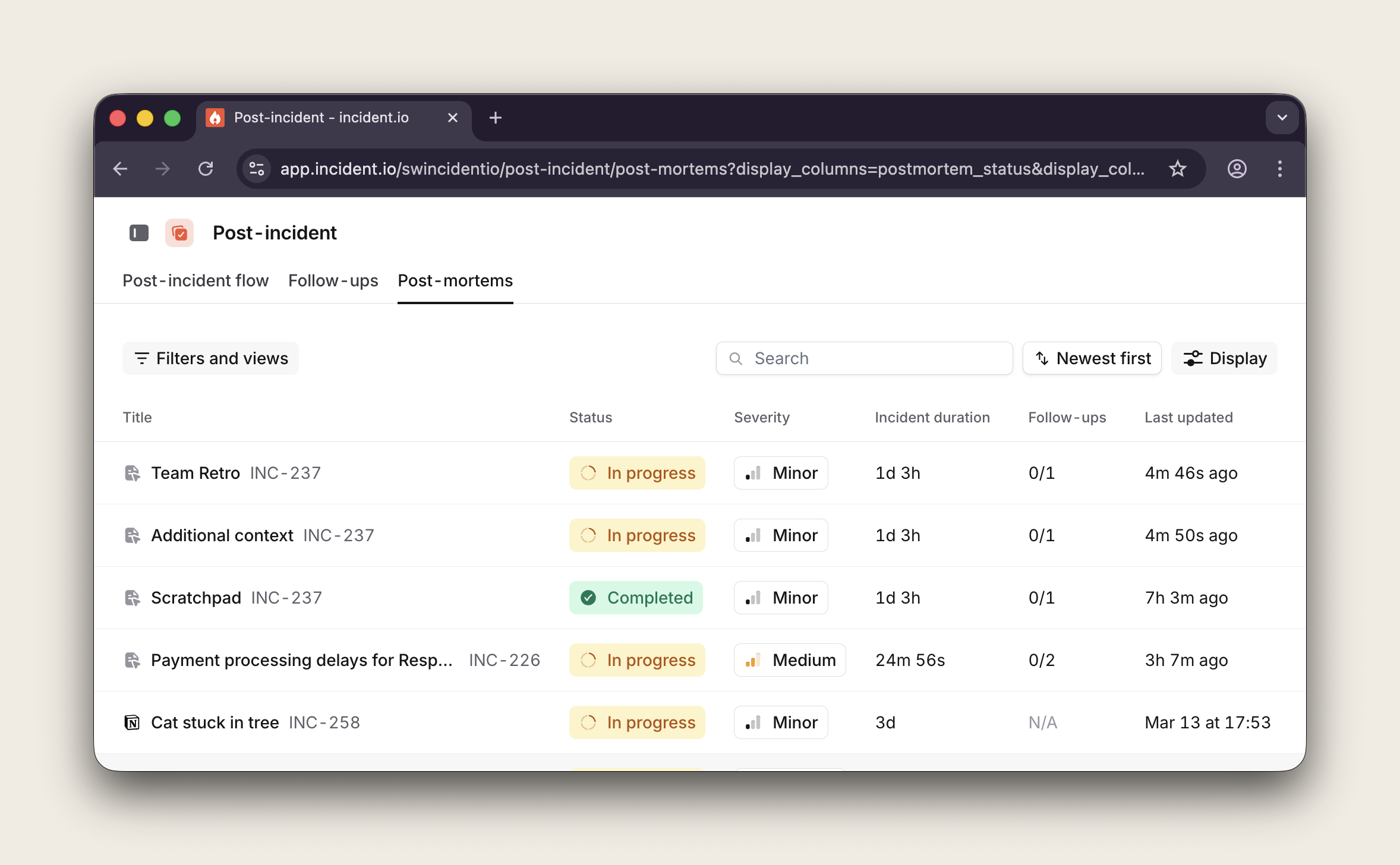By default, the list shows status, severity, incident duration, follow-ups, and last updated. You can customize which columns are visible by clicking the Display button in the toolbar. From there, you can add columns for any of your custom fields or incident roles, so the list shows exactly the information you care about.Saved views