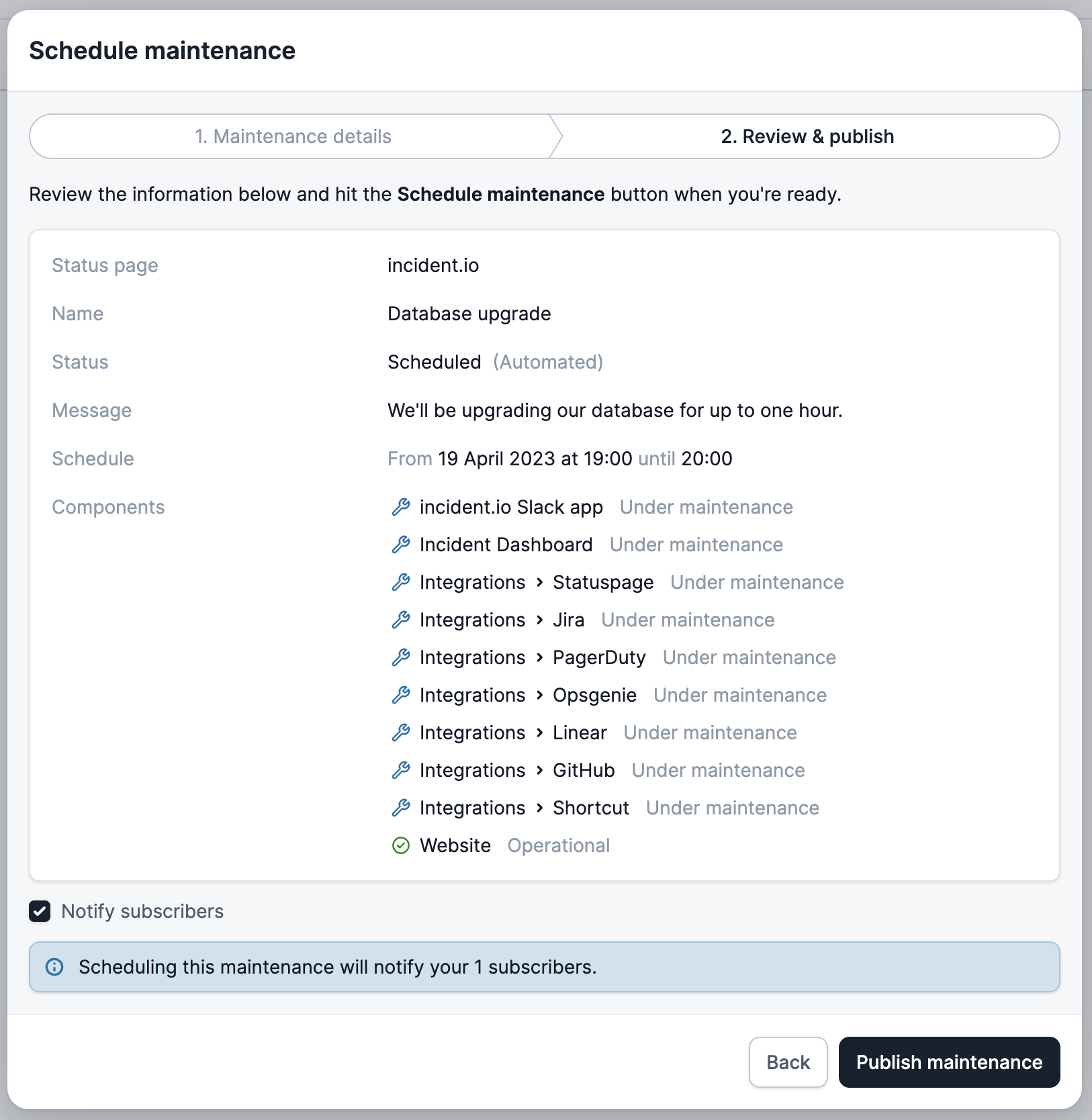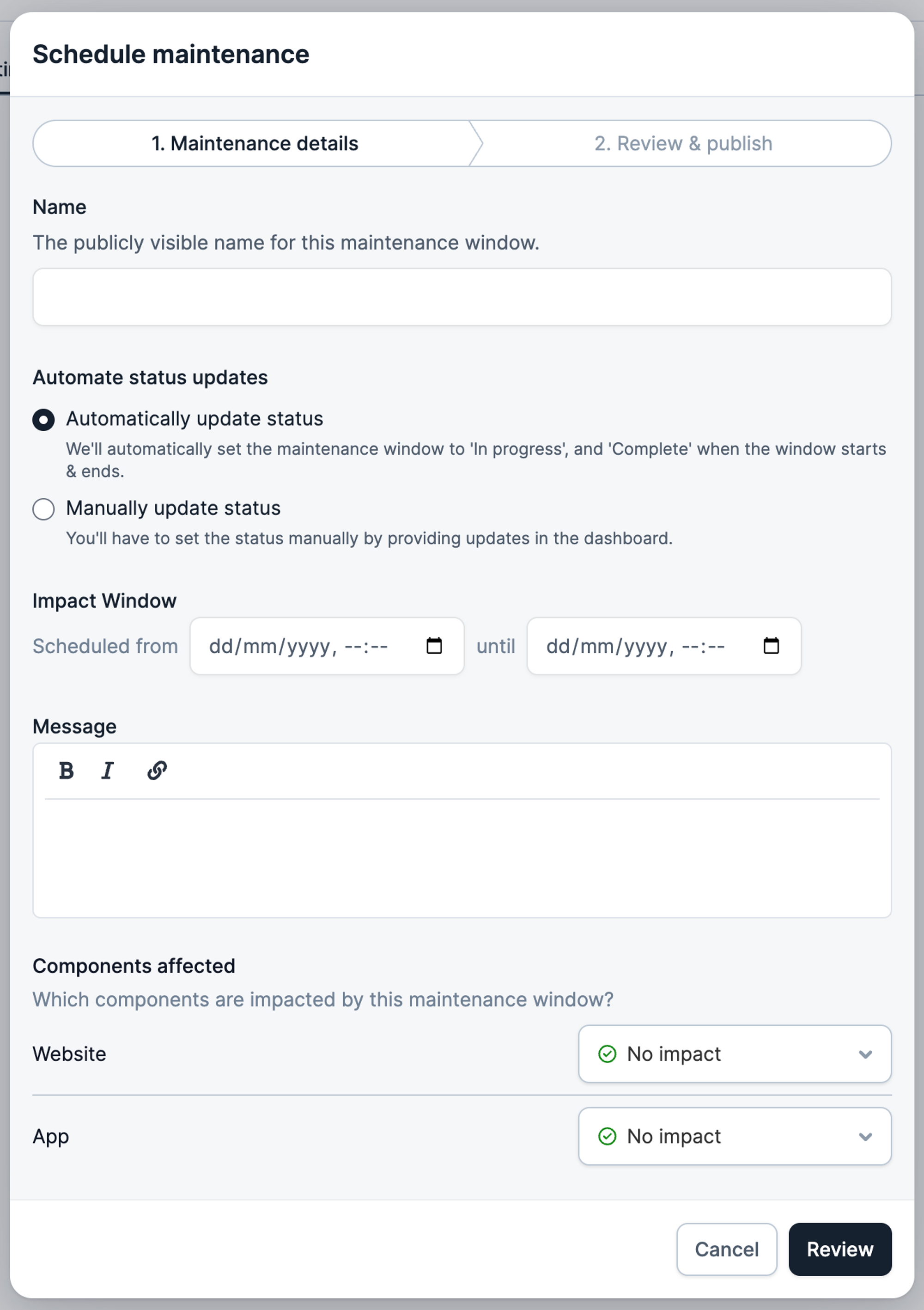 As with an unscheduled incident, click ‘Review’ to double-check before you publish to your status page.