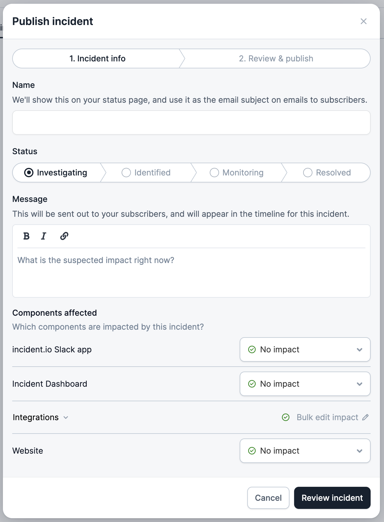 First, navigate to your status pages list , and select the status page you want to update. Click ‘Publish incident’ in the top-right. You’ll see a form like this: