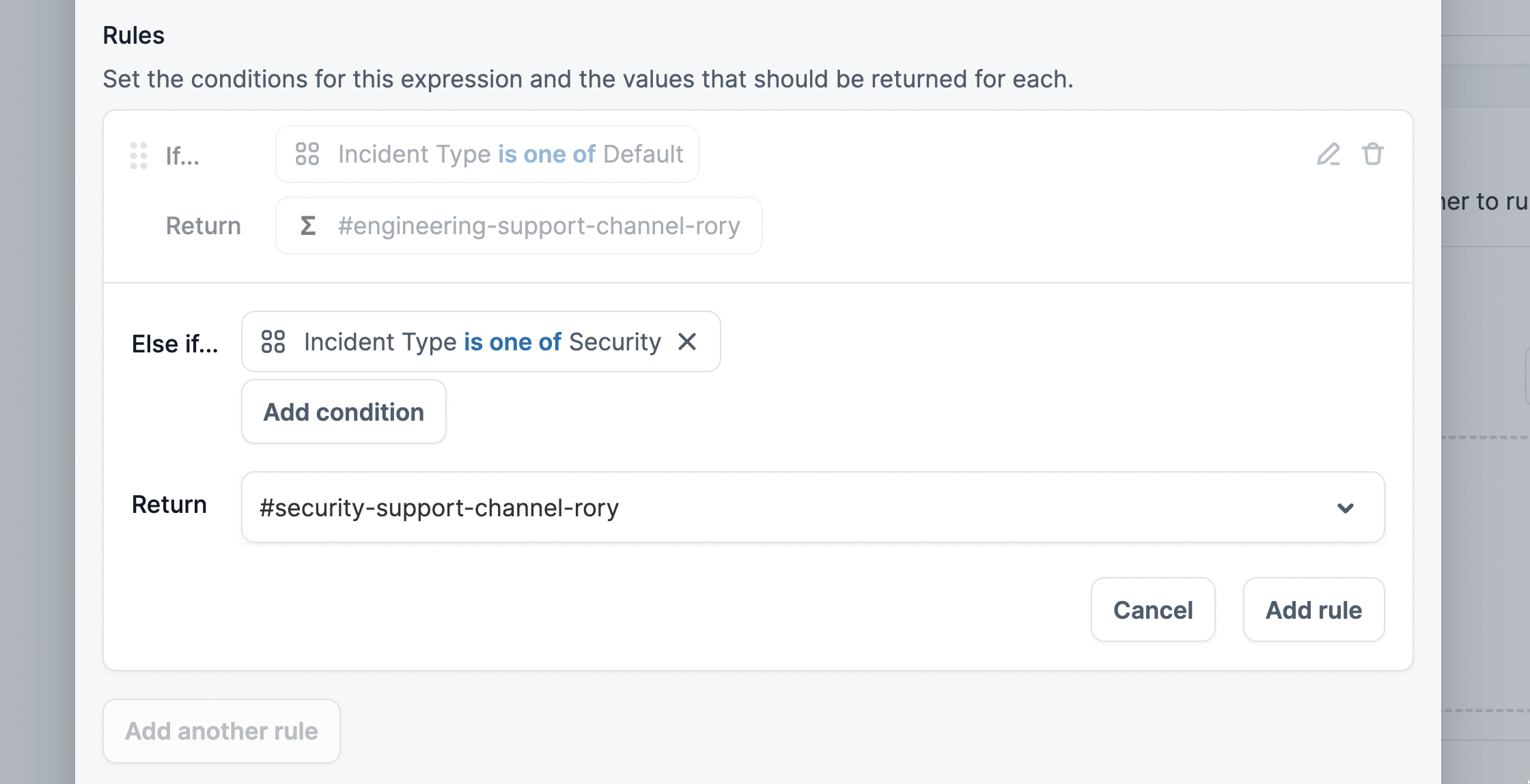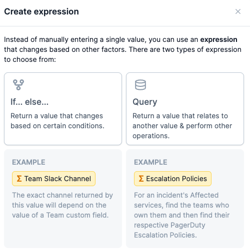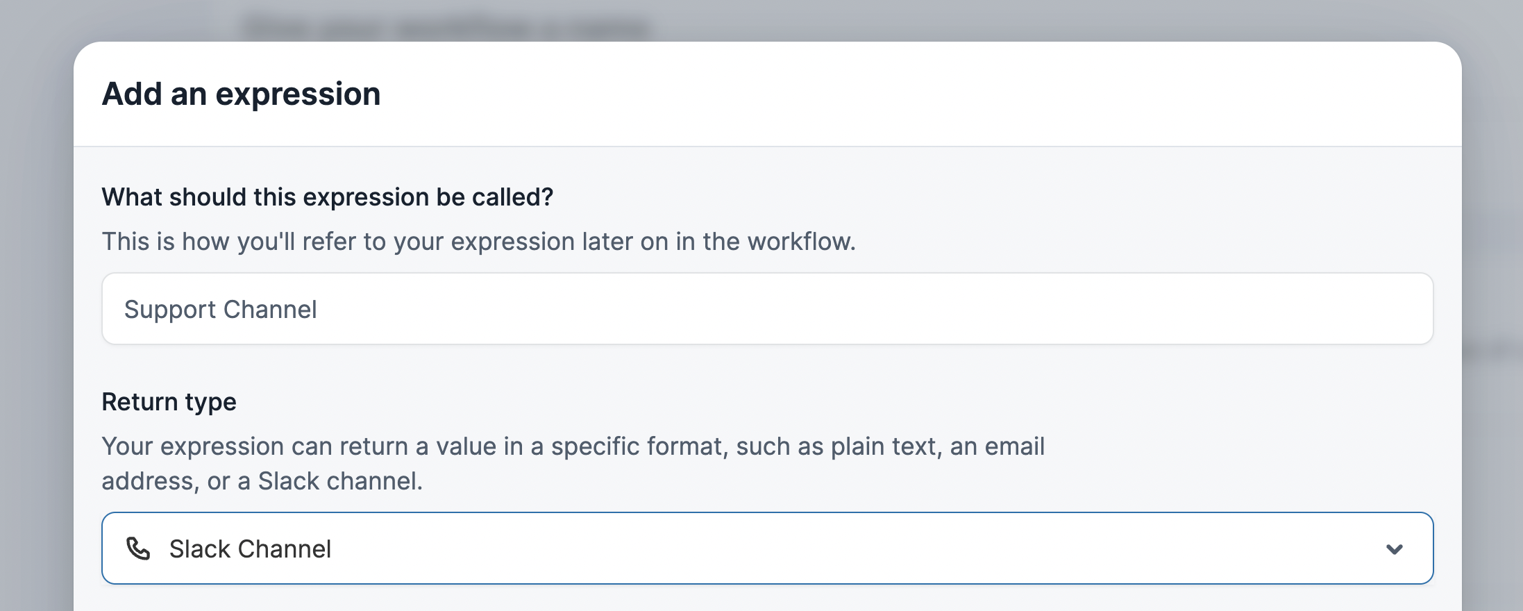 - Choose a return type. This will decide what kind of thing your expression will return (e.g. a Slack Channel or some text).