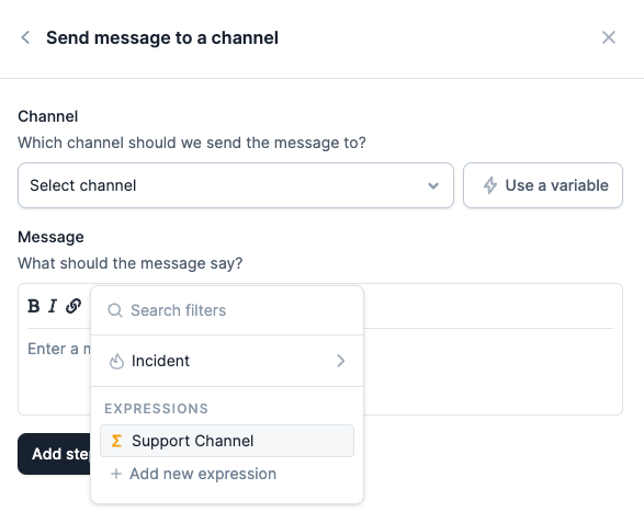 - Please note that not all conditions and steps will accept multiple values. For example, the ‘Send message to Slack Channel’ step expects one single channel. If you choose to return multiple items for a ‘Slack Channel’ expression, then it won’t be available in the ‘Send message to Slack Channel’ options.