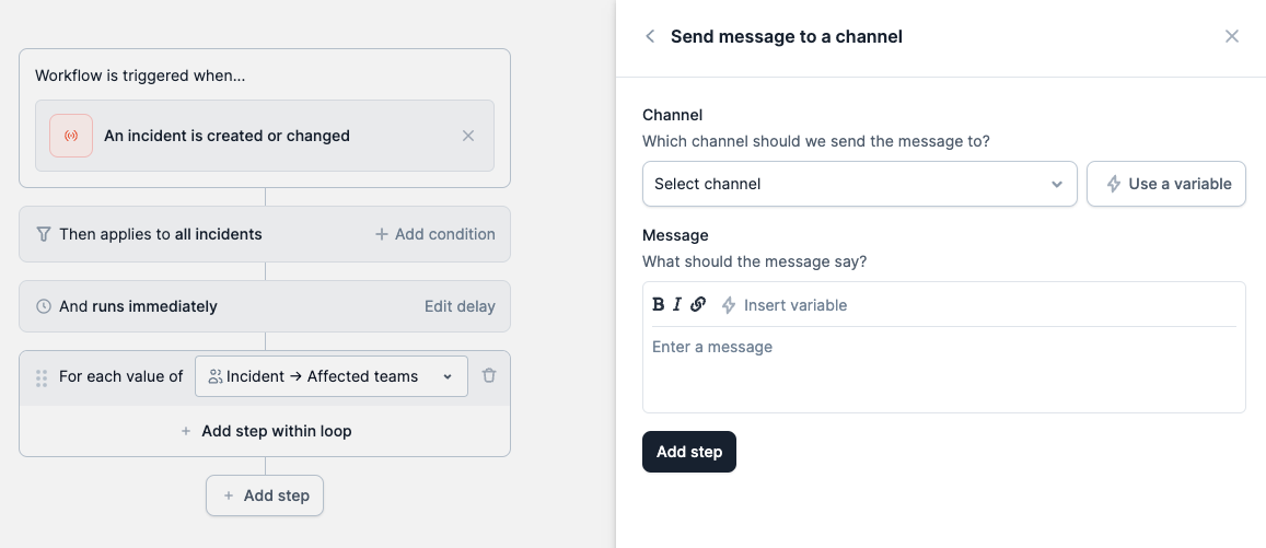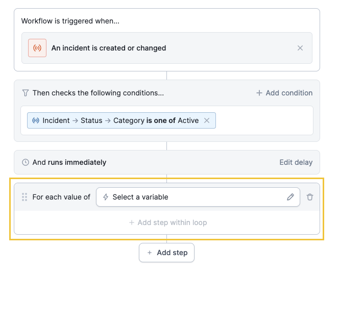 Workflow loops function slightly differently from regular workflow steps - if the custom field or expression you are looping over changes, the loop will run its steps on any new values. Let’s elucidate this with an example: Imagine you have set up a workflow to run once per incident when the incident severity is critical or higher. You’ve got two steps:- Announce the incident in