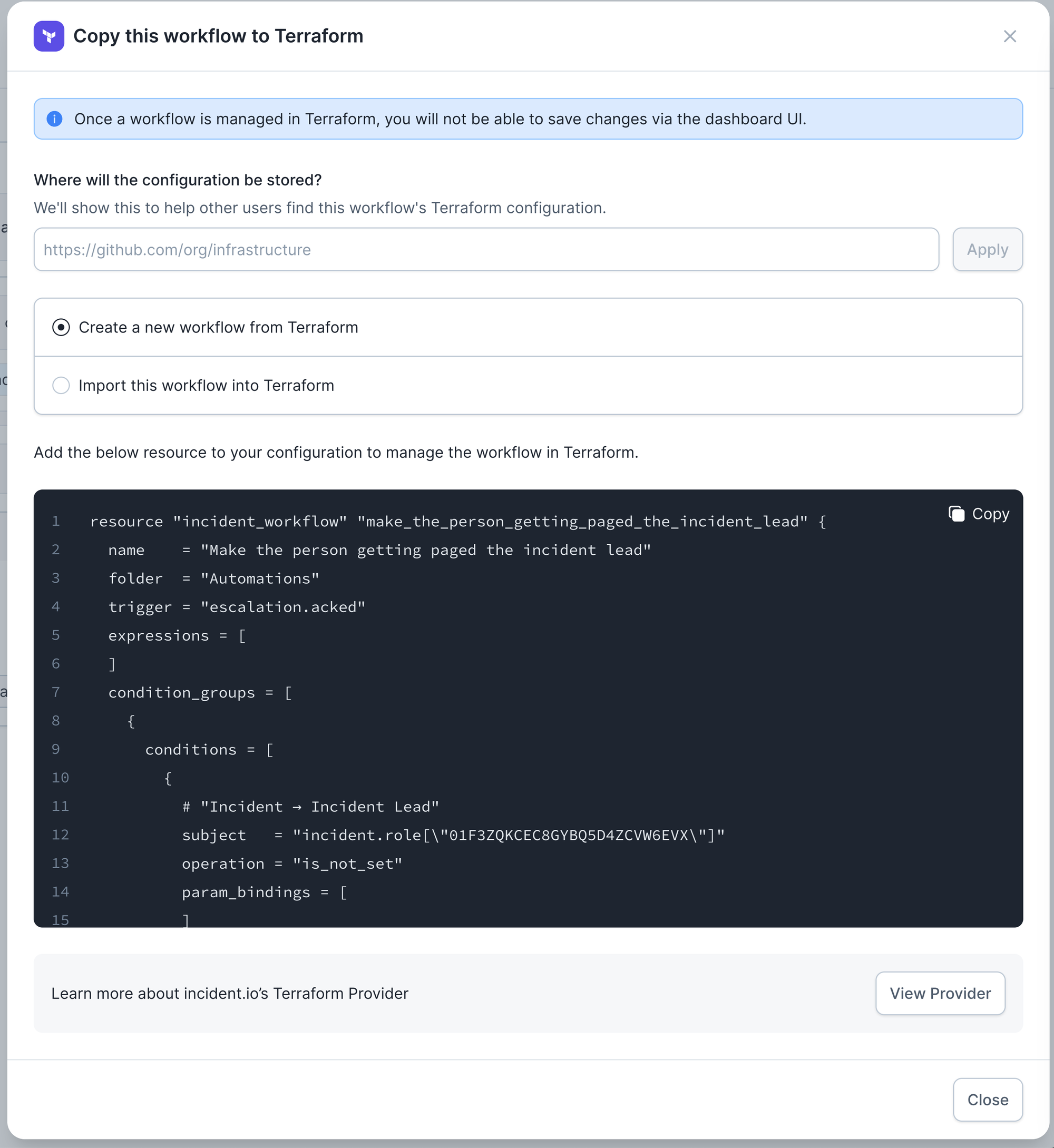 Workflows have a pretty complex structure, so we’d recommend you build your workflow in the UI using our visual builder, and then copy the Terraform that we generate into your repo.