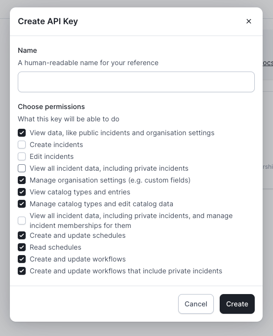As part of the setup you’ll need to create an incident.io API Key. To do all the things we currently support in Terraform, you’ll want to look at giving the key the following permissions. However, you can always refine this if you’re only looking to manage certain components.